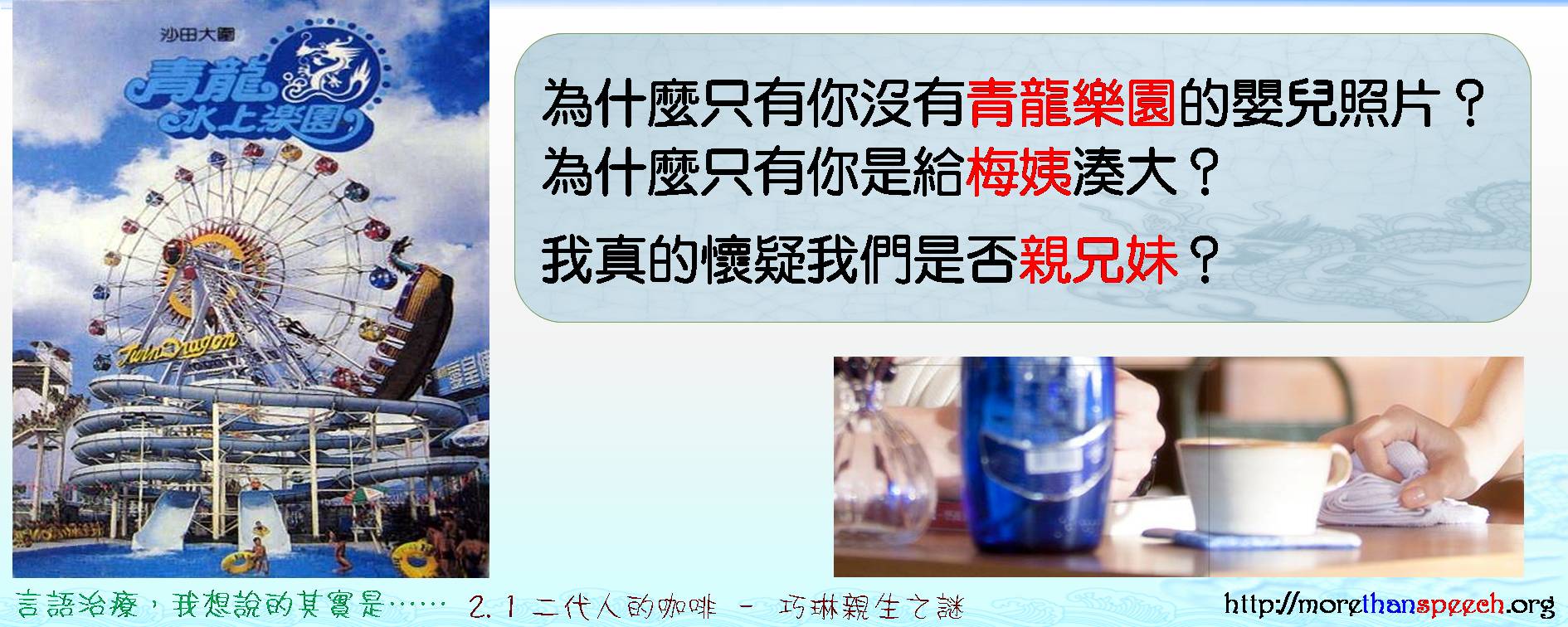 「還好講,你時常提住這個問題,累得我中學時懵懵懂懂地去問爸B,『我是否他親生的』,最終害我受了兩個月經濟制裁…」巧琳丟下小匙羹。