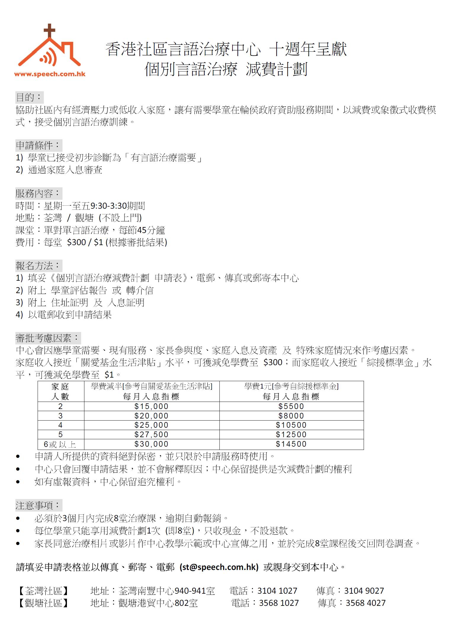 個別言語治療 減費計劃 (第4期) 2016-08-18 By 高展鵬 (言語治療師) 社區十週年 - 個別言語治療 減費計劃 (第4期) 目的: 協助社區內有經濟壓力或低收入家庭, 讓有需要學童在輪侯政府資助服務期間, 以減費或象徵式收費模式,接受個別言語治療訓練。 申請條件: 1) 學童已接受初步診斷為「有言語治療需要」 2) 通過家庭入息審查 報名日期:第4期 – 由 2016年8月18日 至 9月4日 下載【個別言語治療減費計劃 (第4期)申請表】 分享此文: 按一下即可分享至 X(在新視窗中開啟) X 按一下以分享至 Facebook(在新視窗中開啟) Facebook 喜歡 正在載入...