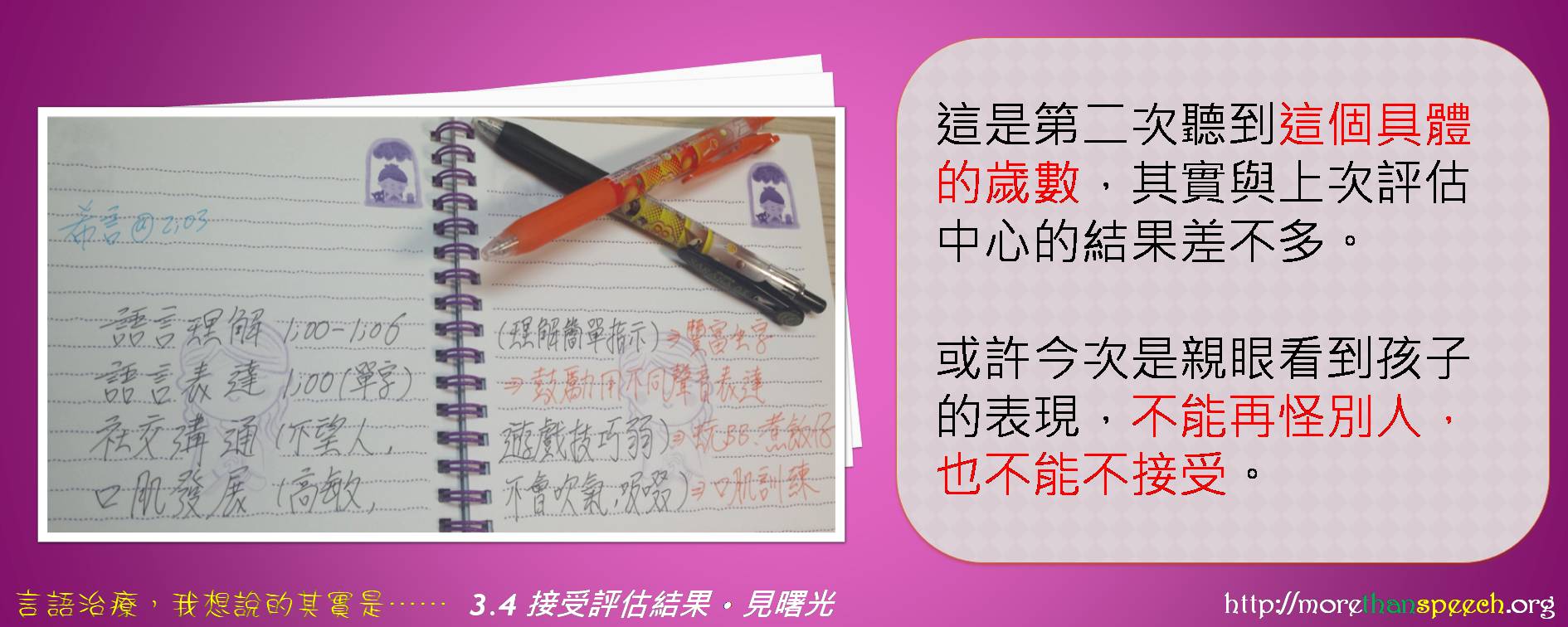 【上文提要:希言兩歲多還未開口講說話,被評為疑有自閉症及言語障礙,父母銳雋及巧琳不斷尋找另類診治。毫無頭緒之際,希言於PLAYGROUP在垃圾桶撿餅干,加上家人的責難,巧琳跌落了人生的谷底。巧琳決定幫希言做言語評估,完成了理解表達、遊戲技巧及口肌測試…】