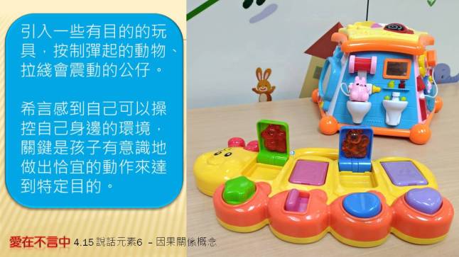 「哈,我們希望希言感到自己可以操控自己身邊的環境,關鍵是孩子有意識地做出恰宜的動作來達到特定目的。」高sir一手拉長繩子,公仔跳動起來:「要公仔震動,就先要拉綫,這是一種因果概念。希言學會,可以增加日常應用,例如,『要飲果汁,先要伸手』、『要玩遊戲,先要坐低等導師叫名』,這對希言的表達動機及社交禮儀都有幫助。」